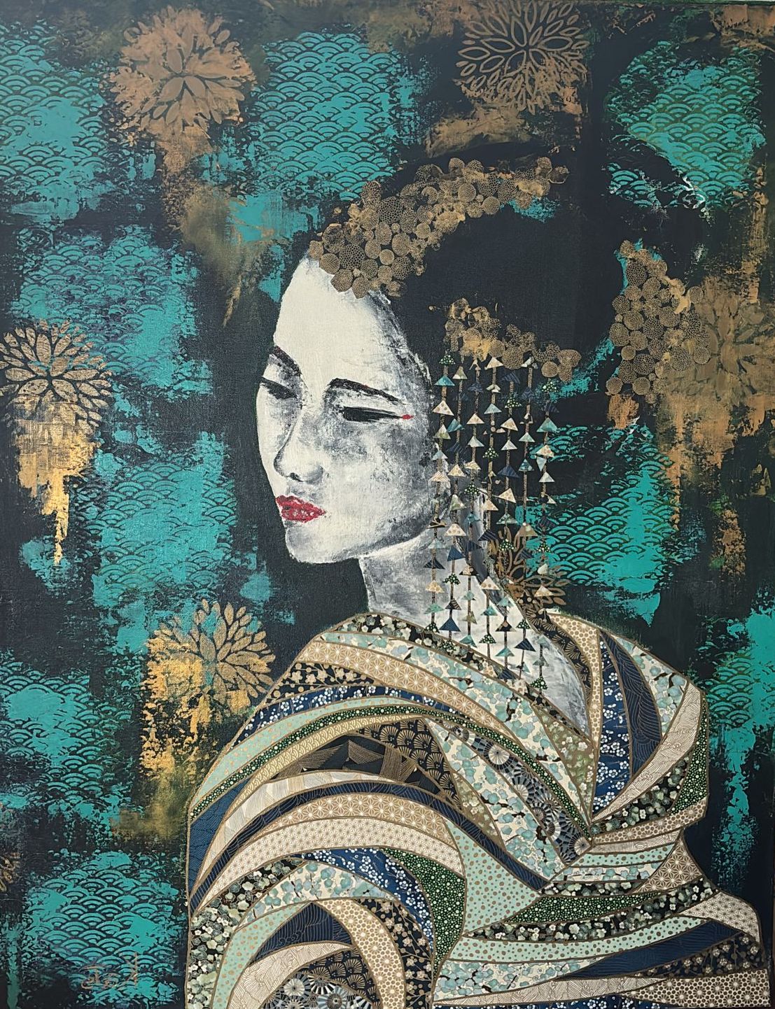 Depuis près de 30 ans, je me consacre à la peinture de la Femme, avec un accent particulier sur les Geishas, ces femmes de l’ombre qui sont des artistes à part entière. Elles incarnent pour moi l’essence de l’Art et de la Féminité, m’emmenant dans des contrées lointaines au plus profond de mon être. Je suis mes toiles, j’y mets mon âme, et grâce à vous, elles voyagent désormais à travers la France et le monde. Ma technique est mixte. Elle mélange la peinture et les collages. Je visualise d’abord la Geisha que je vais peindre, puis vient le choix des couleurs et la mise en œuvre. Mêlant des techniques de street art, la trame de fond, travaillée telle une tapisserie, est faites de manière instinctive et spontanée, au couteau uniquement. Plusieurs textures sont mises en place notamment avec l’inclusion de feuilles d’or. Les visages mettent en contraste les teintes simples – le noir et blanc, le yin et le yang, l’ombre et la lumière – avec un rouge éclatant pour des lèvres toujours sensuelles. Pour les kimonos, j’utilise des papiers japonais précieux, les washis, issus d’une technique ancestrale. Ces papiers, doux et souples, sont fabriqués à partir de l’écorce du mûrier et imprimés par sérigraphie avec des motifs modernes ou symboliques (les grues, les vagues etc ). Je crée ces kimonos sous forme de patchwork, dans un jeu de découpage et collage méticuleux, où chaque morceau est pensé et arrangé avec soin. Tel un art japonais, cette conception est délicate et complexe.