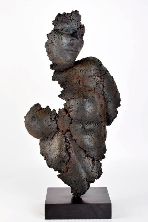 La figure féminine, son thème de prédilection, est sublimée par un jeu de construction et décomposition. Déhanchement, torsion, courbure ou posture douce, corps et visages ébauchés naissent du feu pour laisser place à la matière fragmentée, craquelée… Les terres et bronzes de Philippe MOREL, entre force et fragilité emmènent chacun de nous dans son propre imaginaire.
